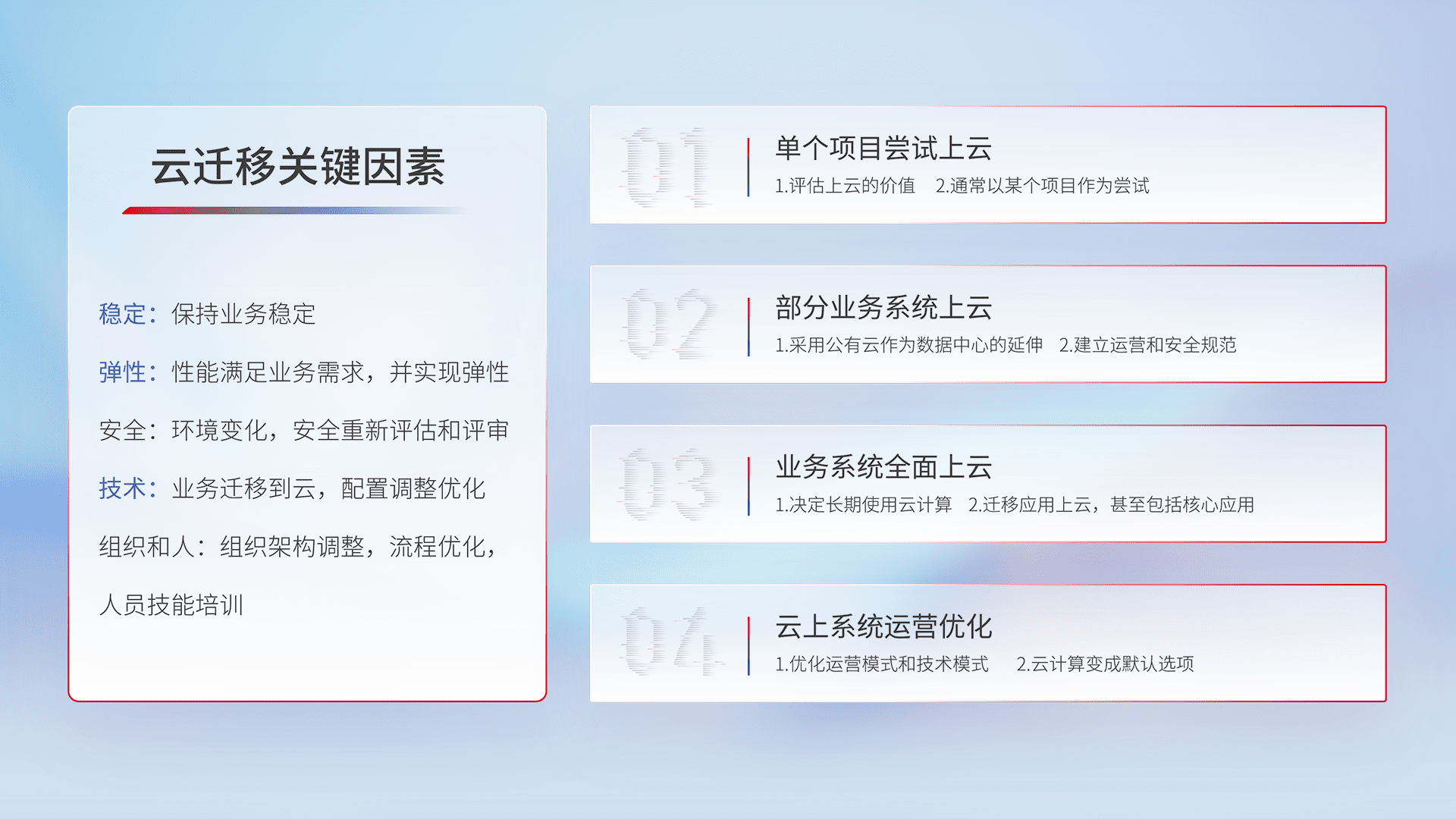 结合实际业务,,,,从规划设计、、、云平台选型、、云原生改造、、、、数据迁移、、、、集成交付,,,,迁移全过程为客户识别最佳上云路径,,,,做好风险识别管理,,,,设计网络架构、、身份权限、、安全审计合规、、、、操作审计、、、、日志审计、、、、监控告警策略、、、、多站点容灾设计等,,,,对云上基础设施进行整体规划,,提升IT治理水平,,,,以满足弹性、、、、高可用、、、高性能的需求。。。
