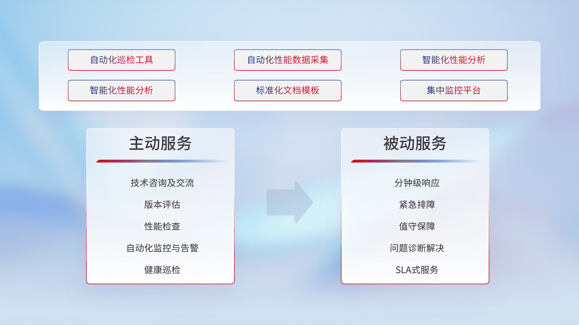 智能化工具和标准化文档,,,保障服务质量,,,提供主动服务(包含技术咨询、、版本评估、、性能检查、、、自动化监控与告警、、健康巡检)和被动服务包含(分钟级响应、、、、紧急排障、、值守保障、、问题诊断解决、、SLA服务)。。。